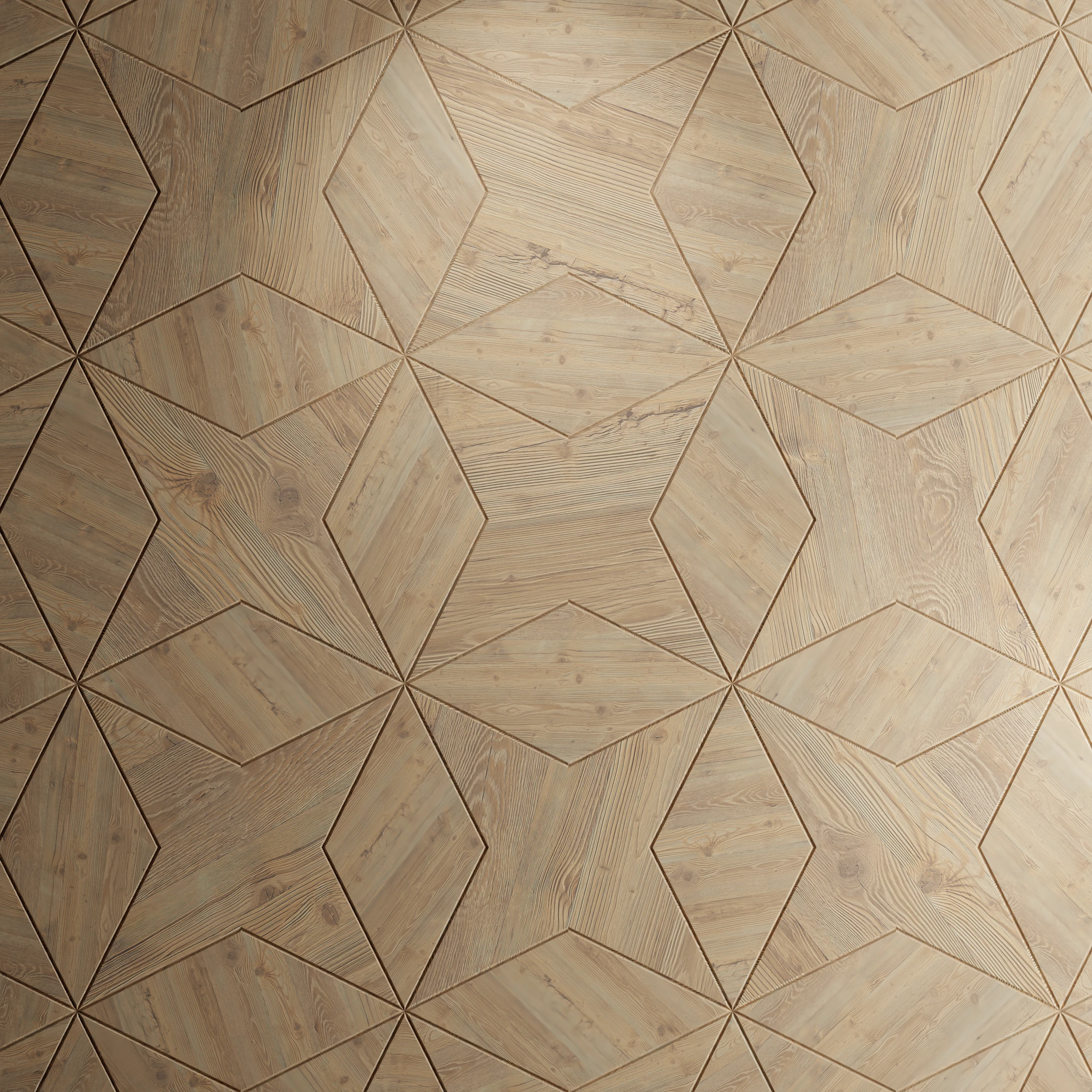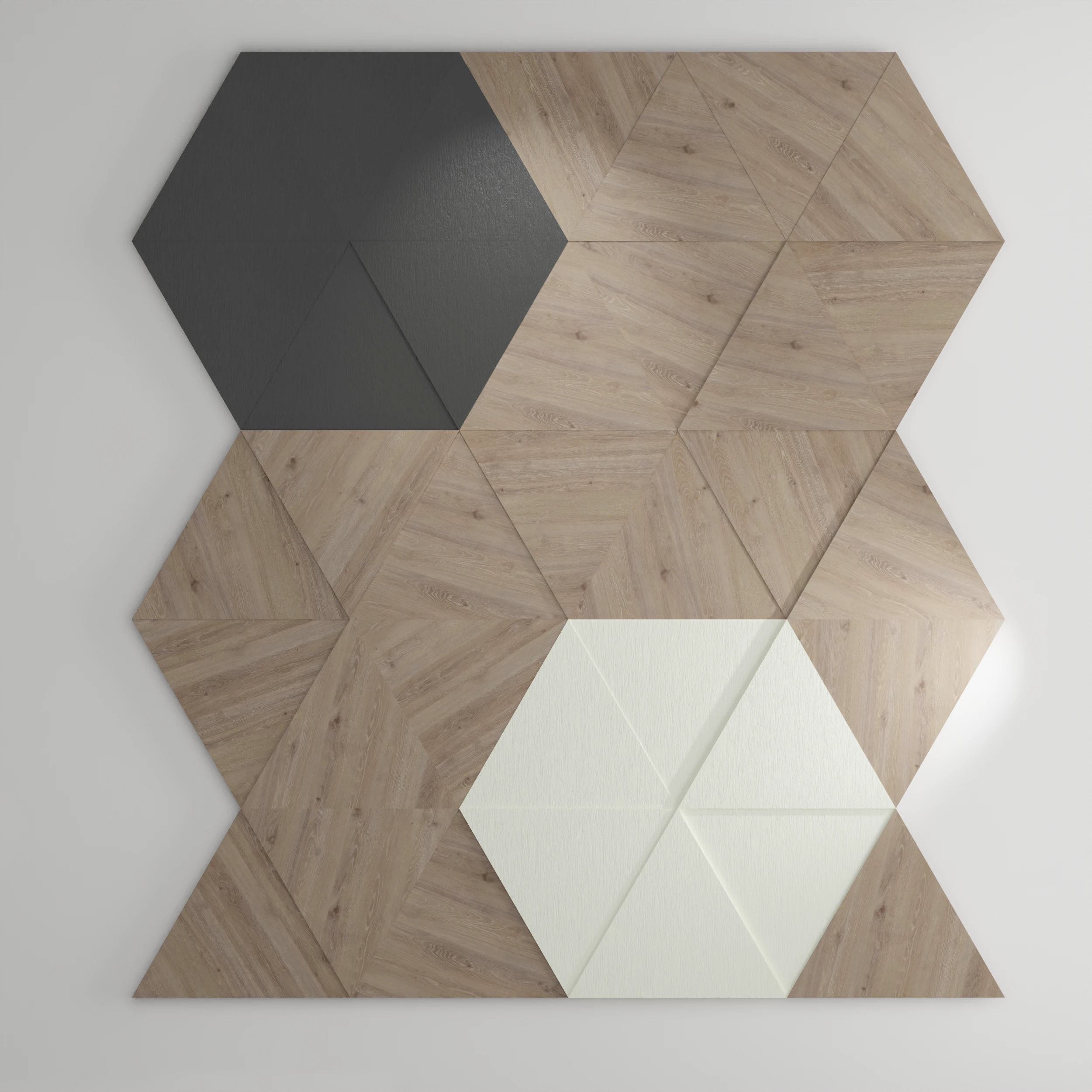 This wall decoration is created through the assembly of solid wood tiles, crafted like small panels and arranged to form