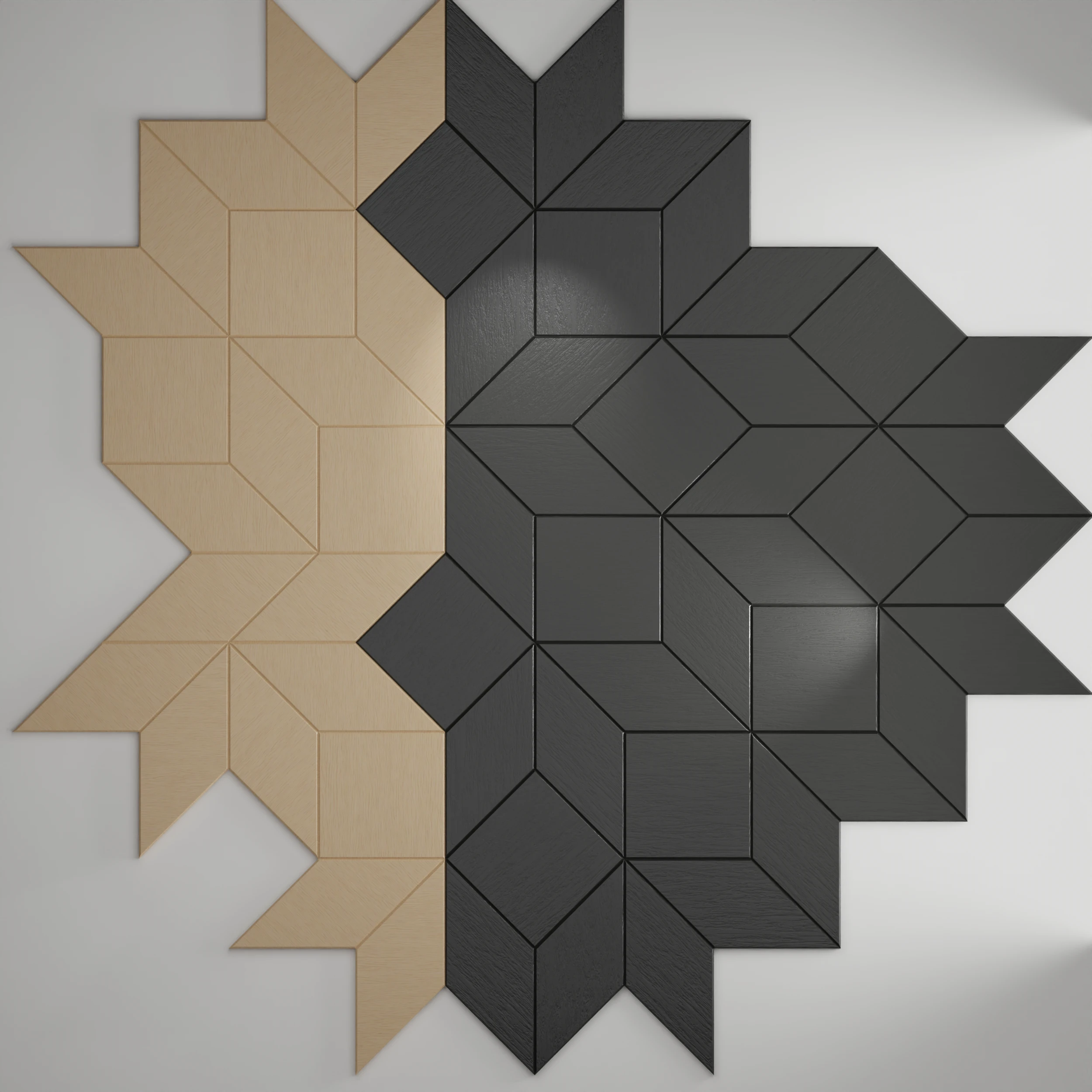 A bold and refined wooden wall panel that plays with contrast and symmetry. Featuring a star-like pattern split into light and dark wood tones, this design creates a striking visual dialogue between texture and geometry. Ideal for feature walls, creative interiors, or refined commercial spaces.
